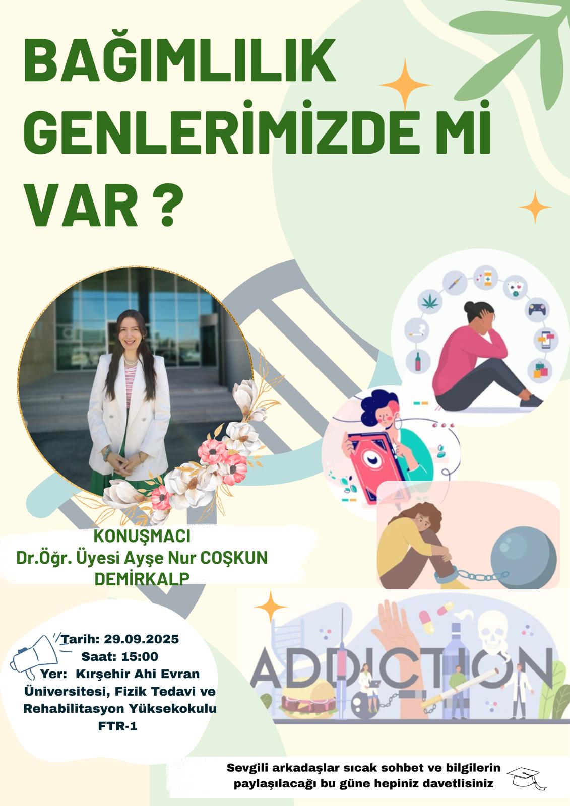 Kırşehir Ahi Evran Üniversitesi Fizik Tedavi ve Rehabilitasyon Yüksekokulu’nda Fizyoterapi ve Rehabilitasyon Bölümü 1. sınıf öğrencilerine yönelik “Bağımlılık Genlerimizde mi Var?” adlı etkinlik gerçekleştirilecektir. Tüm öğrenci arkadaşlarımız davetlidir.